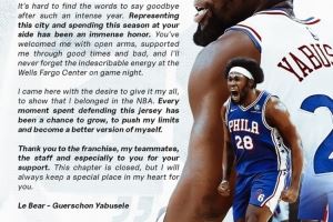 “亲爱的费城,经历了如此密集的一年后,要说再见真的很难。能够代表这座城市,为你们而战度过这个赛季,是无上的荣耀。你们张开双臂欢迎我,在顺境与逆境中都支持我,我永远不会忘记每个比赛之夜,我们主场那难以言喻的能量。