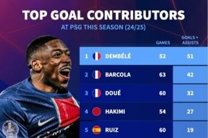 巴黎本赛季球员直接参与进球榜:(进球+助攻)