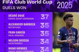 体育资讯7月11日讯 本届世俱杯仅剩巴黎vs切尔西的决赛,数据机构squakwa也统计了本届赛事成功对抗情况,巴黎20岁前锋杜埃领跑。