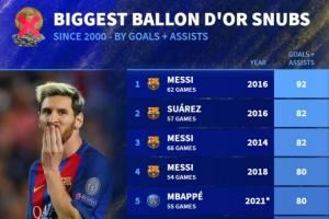 🤔无缘金球年份最高进球+助攻数据榜:前4梅西占3席 C罗3度上榜