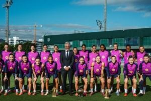体育资讯9月25日讯 近日,巴萨女足球员邦马蒂、维姬-洛佩兹和埃瓦-帕乔尔在金球奖颁奖典礼上获奖归来之后,女足全体队员与三座奖杯进行了合影。